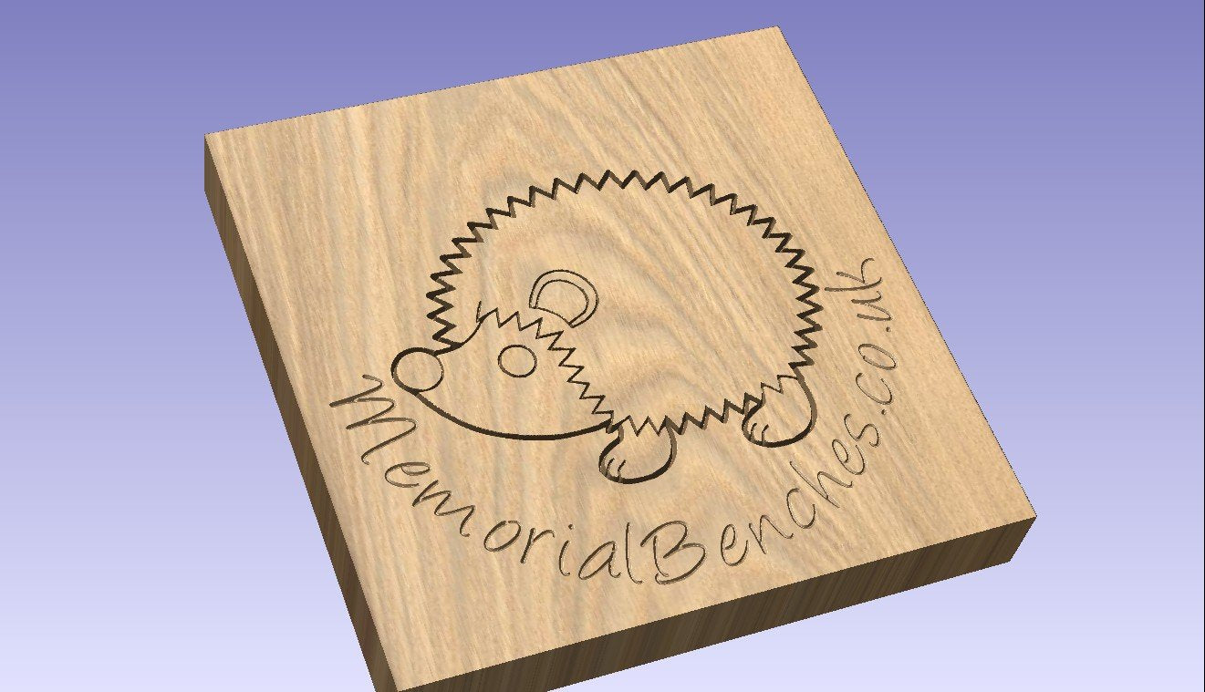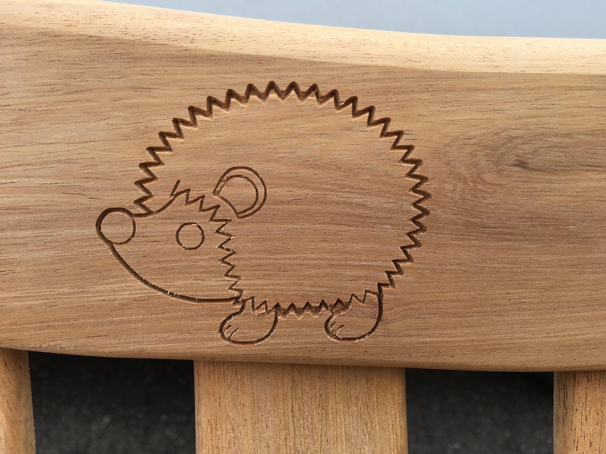 Hedgehog engraved into wood on a memorial bench
