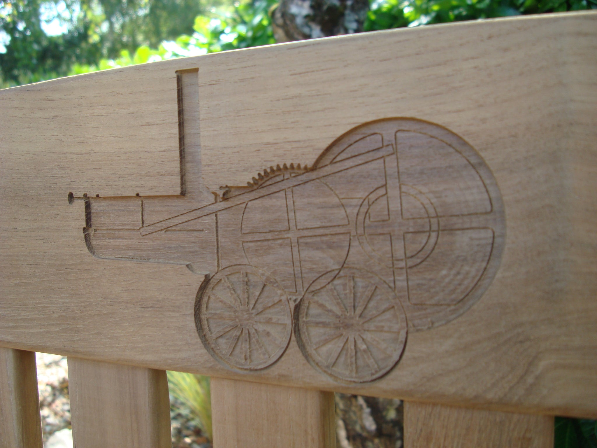 Steam engine carved into wood on a memorial bench - 4mb1897